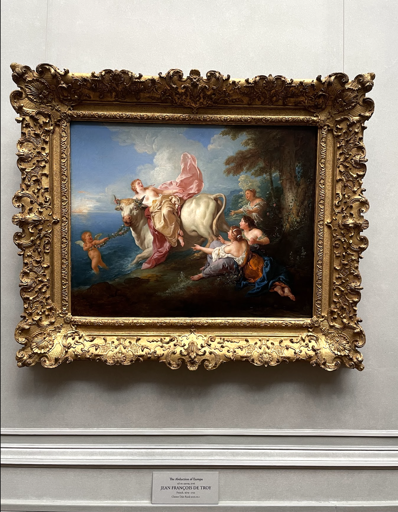 I saw lots of various Rococo art, which is definitely one of my favorite movements we studied. I ended up going back to a couple of different rooms and just sitting in for a bit. I saw the Abduction of Europa and The Birth of Venus by Jean Françios de Troy both of which I loved and were so pretty I could have stared at them for ages. Rococo is characterized by its pastel colors and excess of floral and natural elements, as well as little floating cherubs everywhere. It was a movement following the Baroque period, where everything had lots of strong value contrast and dark hues, and consequently, Rococo art countered many of the intense Baroque characteristics.